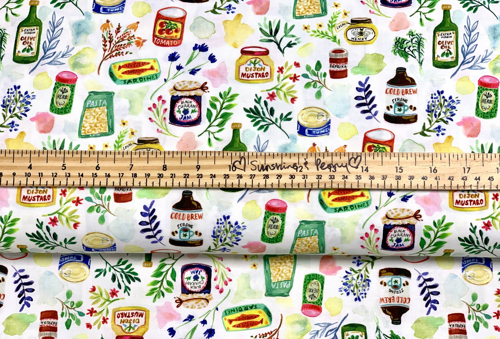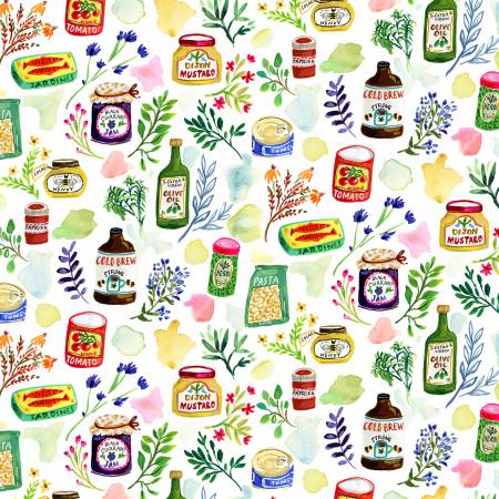 - Ce tissu présente différents types d'aliments gastronomiques, de sauces, de confitures et de boissons.