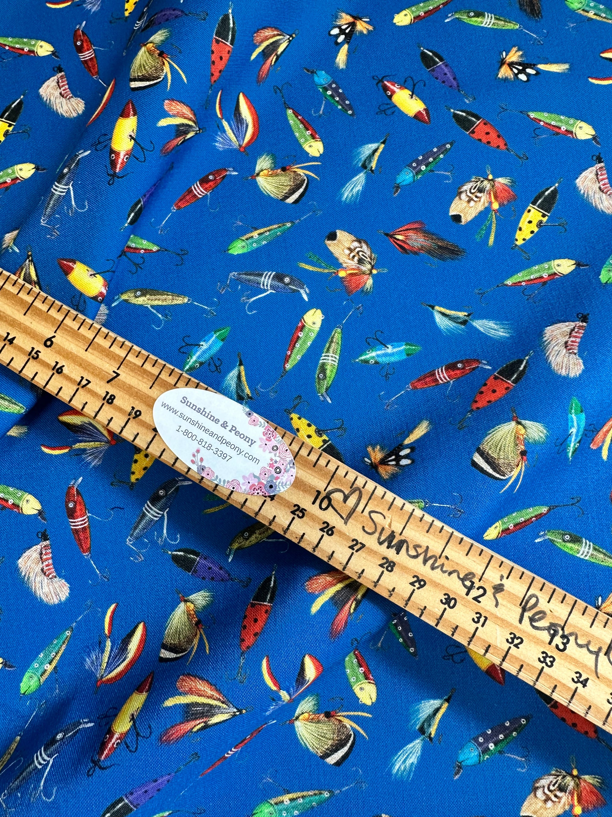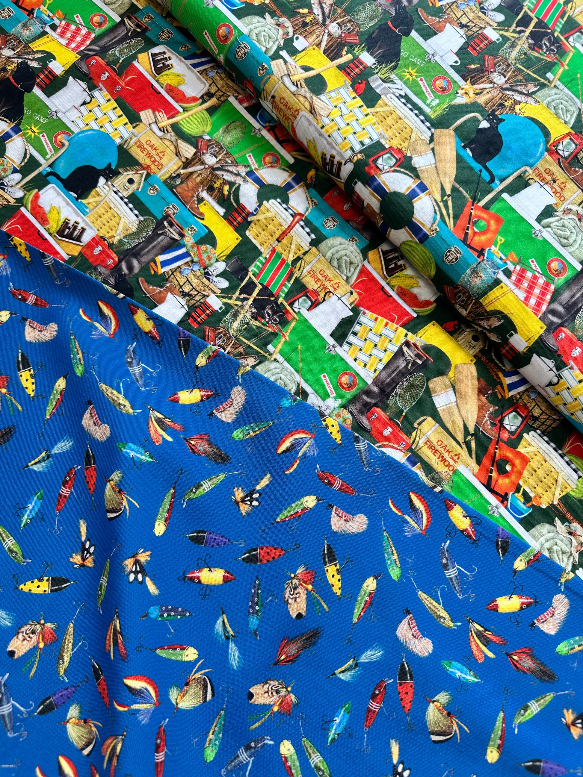 - This fabric is perfect for the fly fishing enthusiast on your list and features colourful lures on a bright blue background.