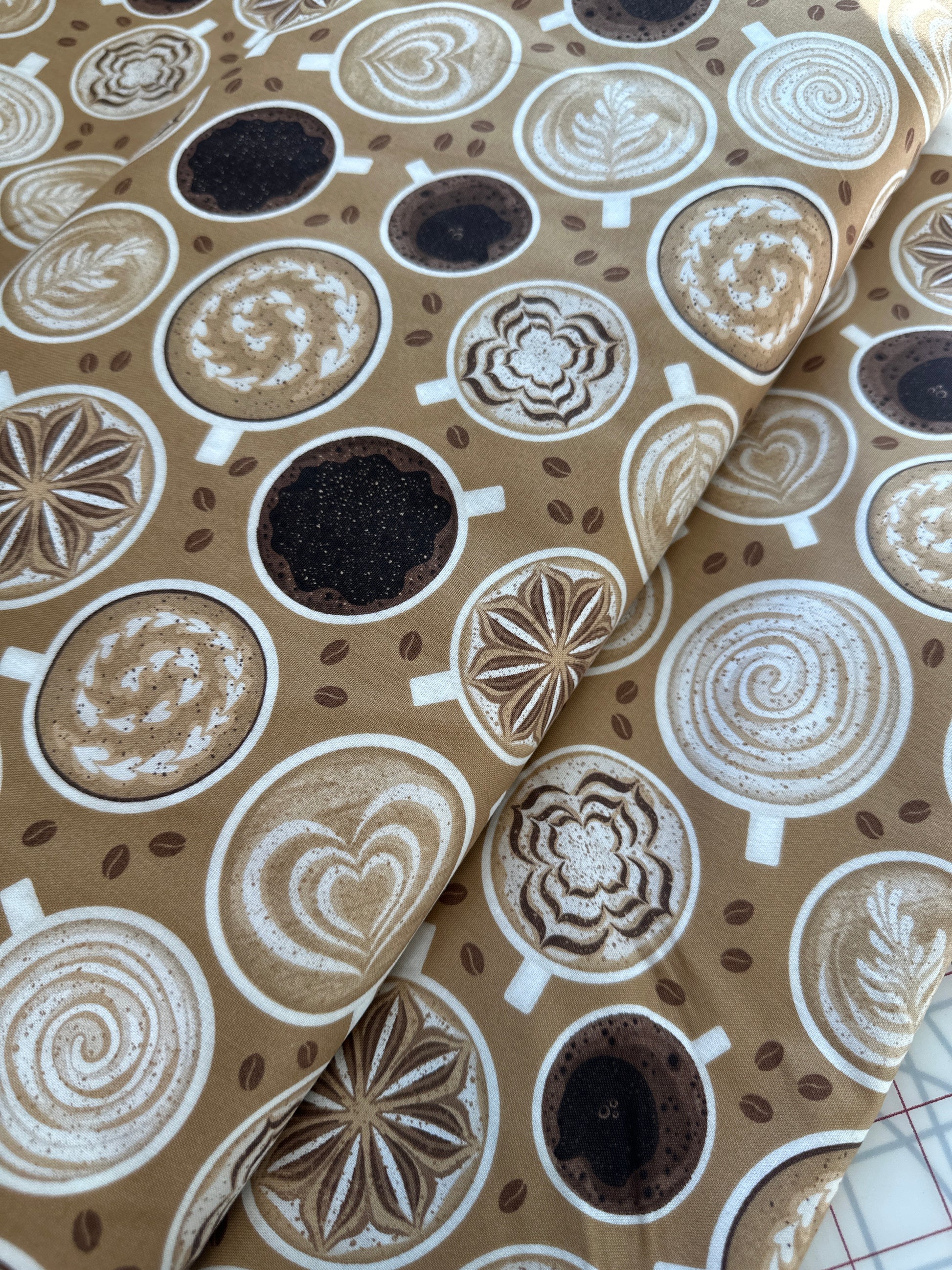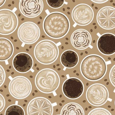 This fabric is made especially for all of us Coffee Lovers and features cups of coffee, Cappucino's , Caffe Latte on a soft cafe latte background.
