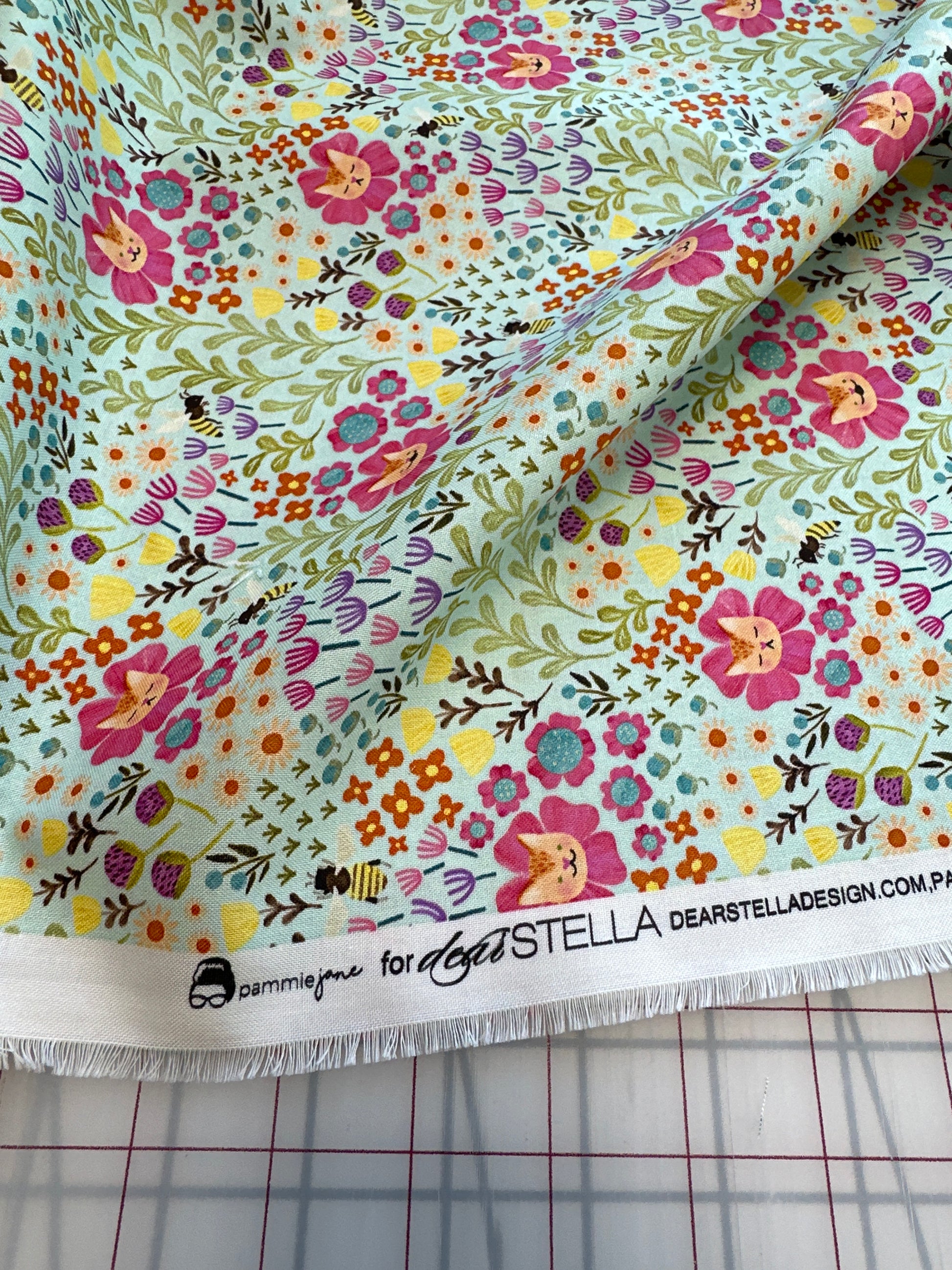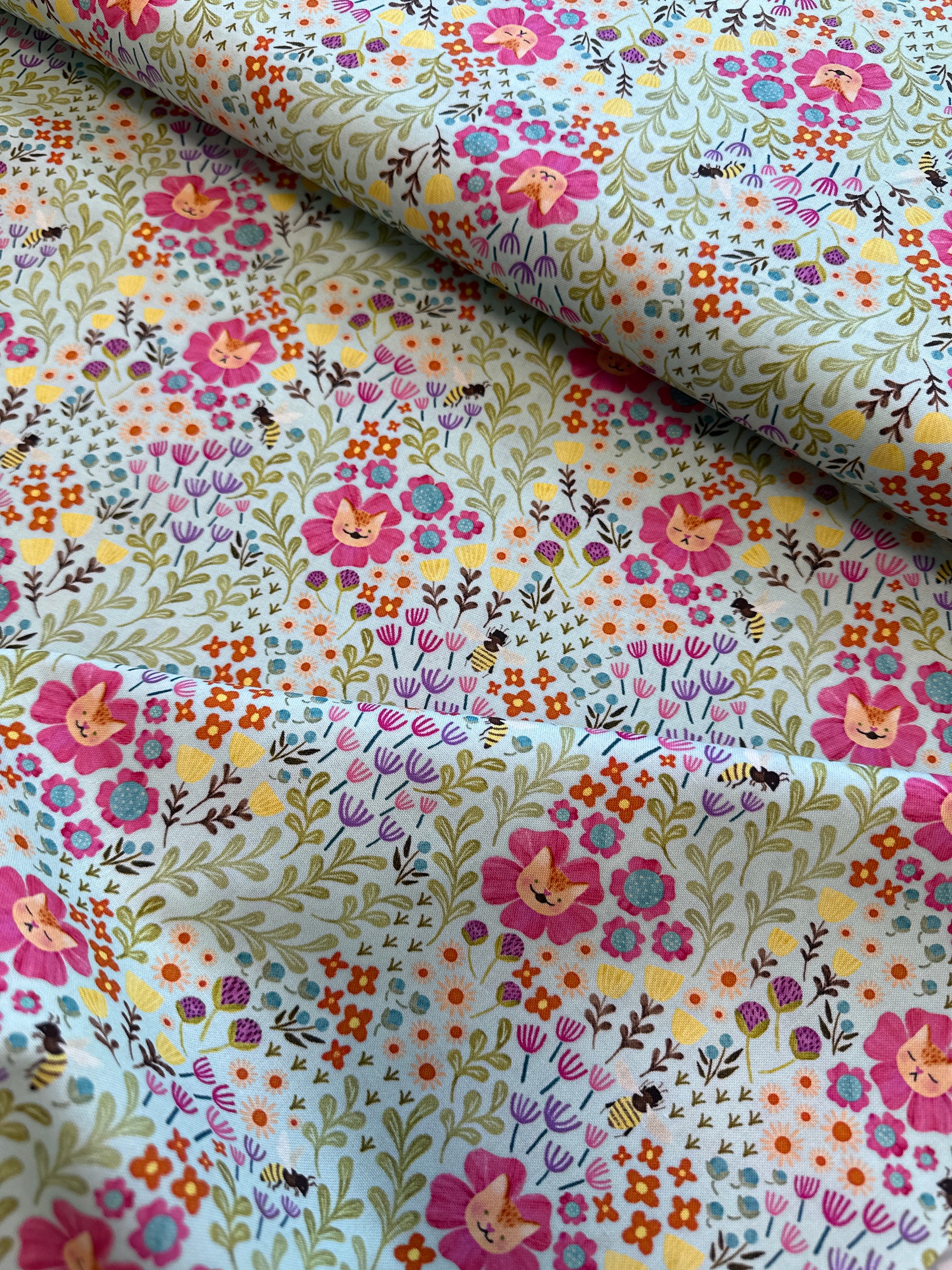 - This fabric features the cutest kitties among soft florals