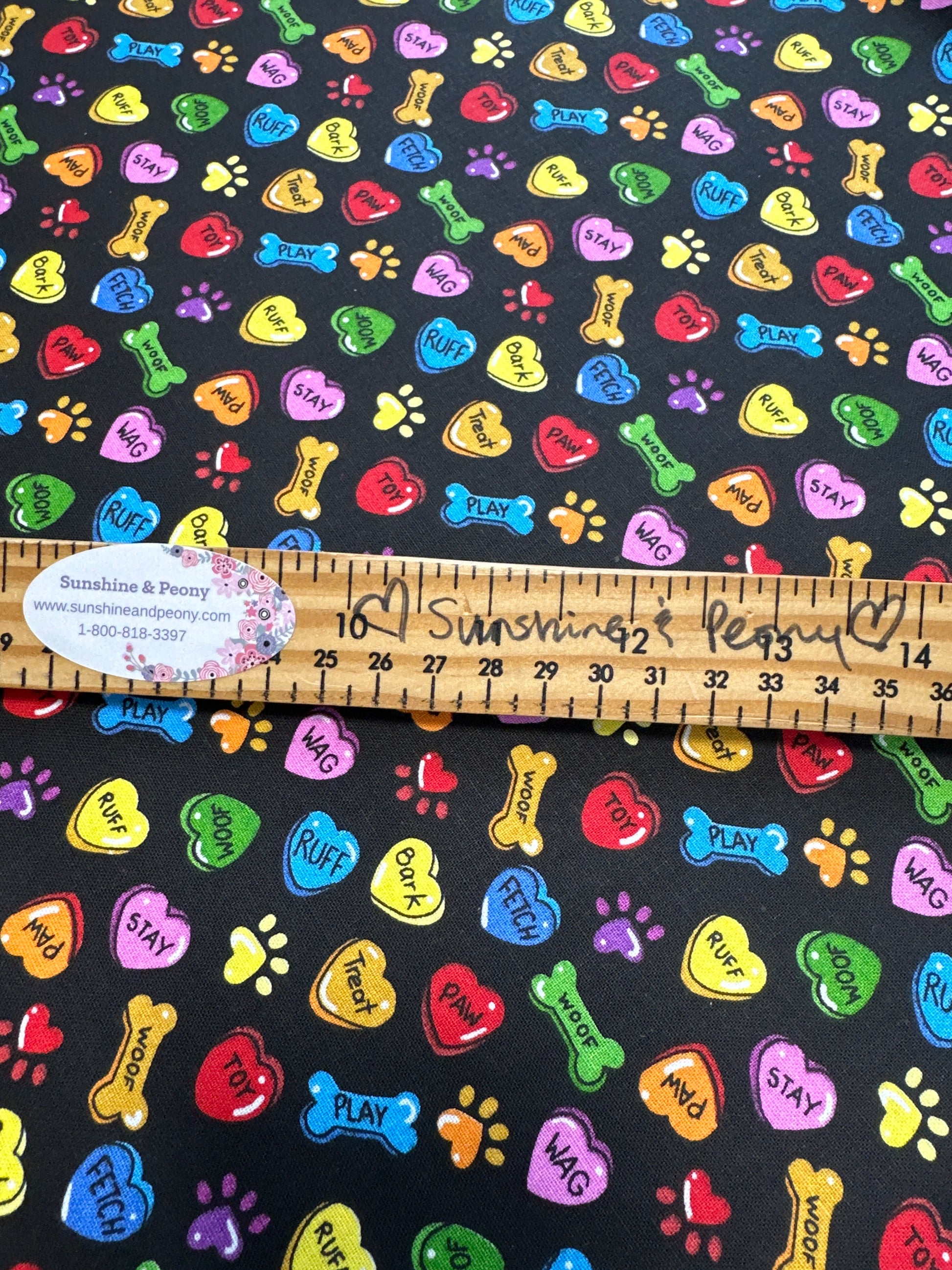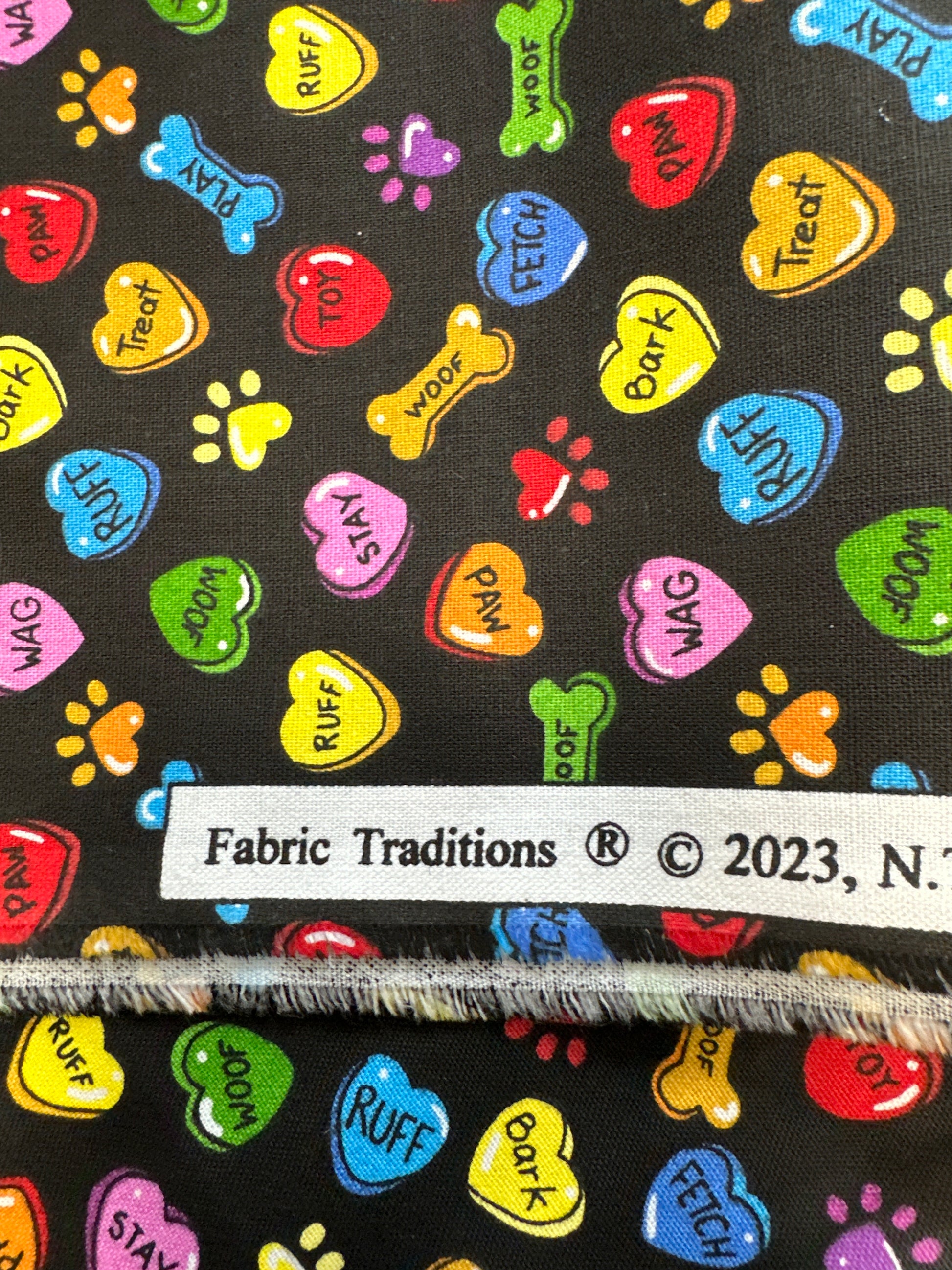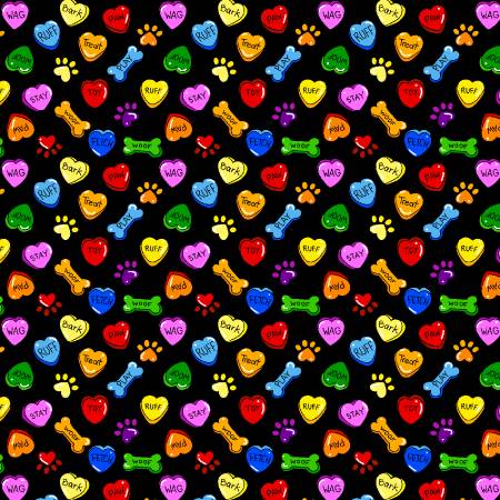 - This fabric features cute colorful hearts, bones and puppy paw prints on a black background