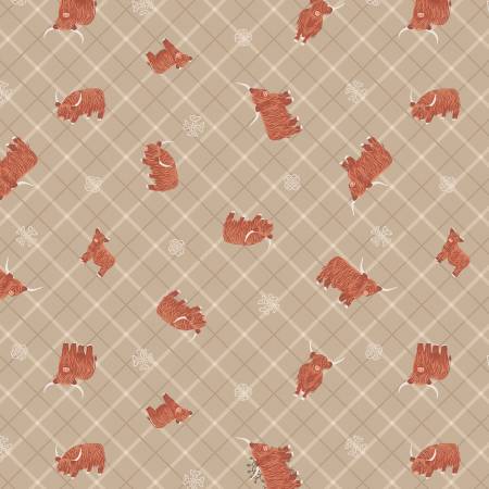 Highland cow on natural celtic check - Part of the Lewis & Irene small things Celtic Collection - Sold and priced by the Half Metre