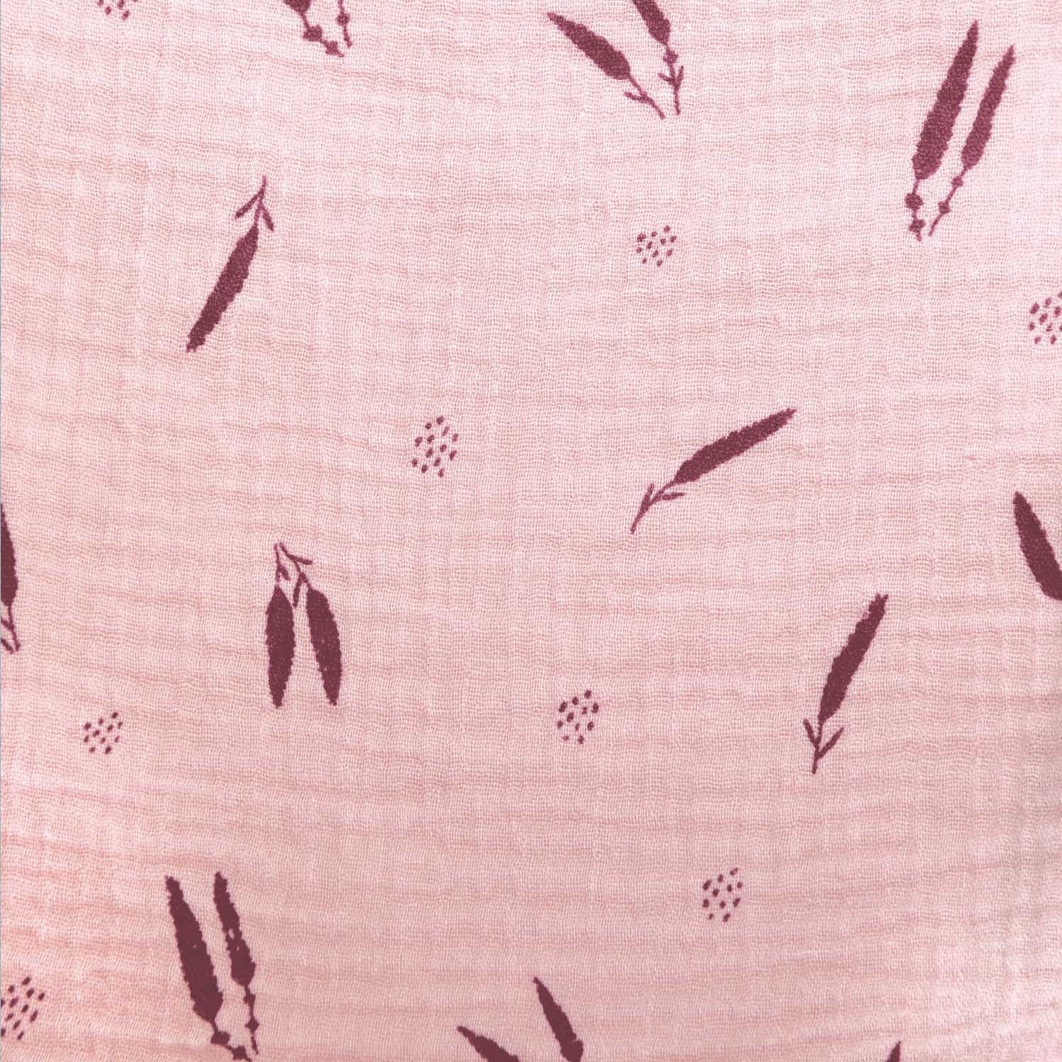 100% muslin cotton with a print featuring lavender on a pink background. Double layer fabric, soft and agreeable handle. Ideal for sewing kid's and baby clothing and accessories.