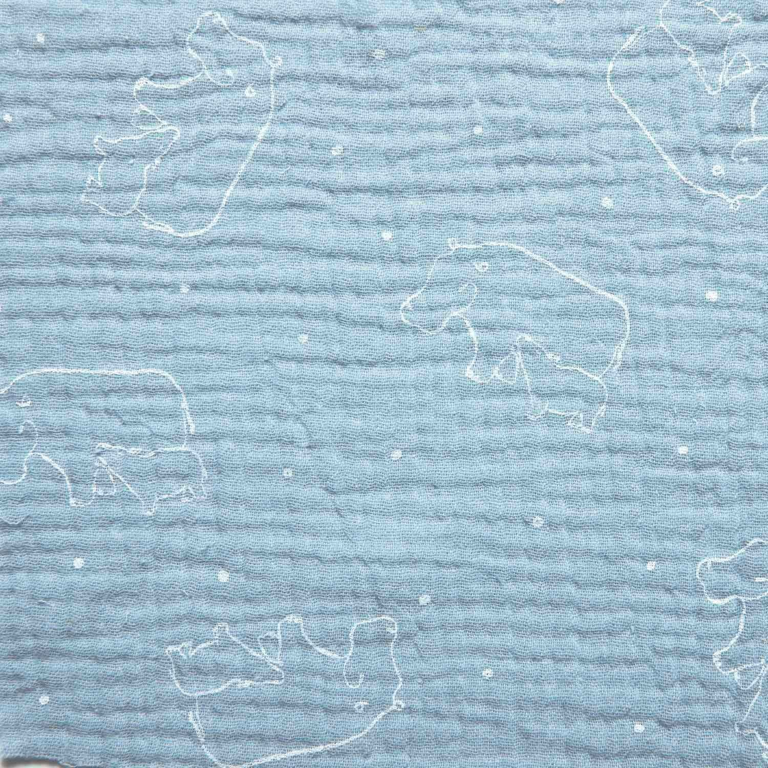 Double-layered, 100% cotton fabric with a delicate print of white hippos with their babies on a sky blue background. A timeless print perfect for baby showers.