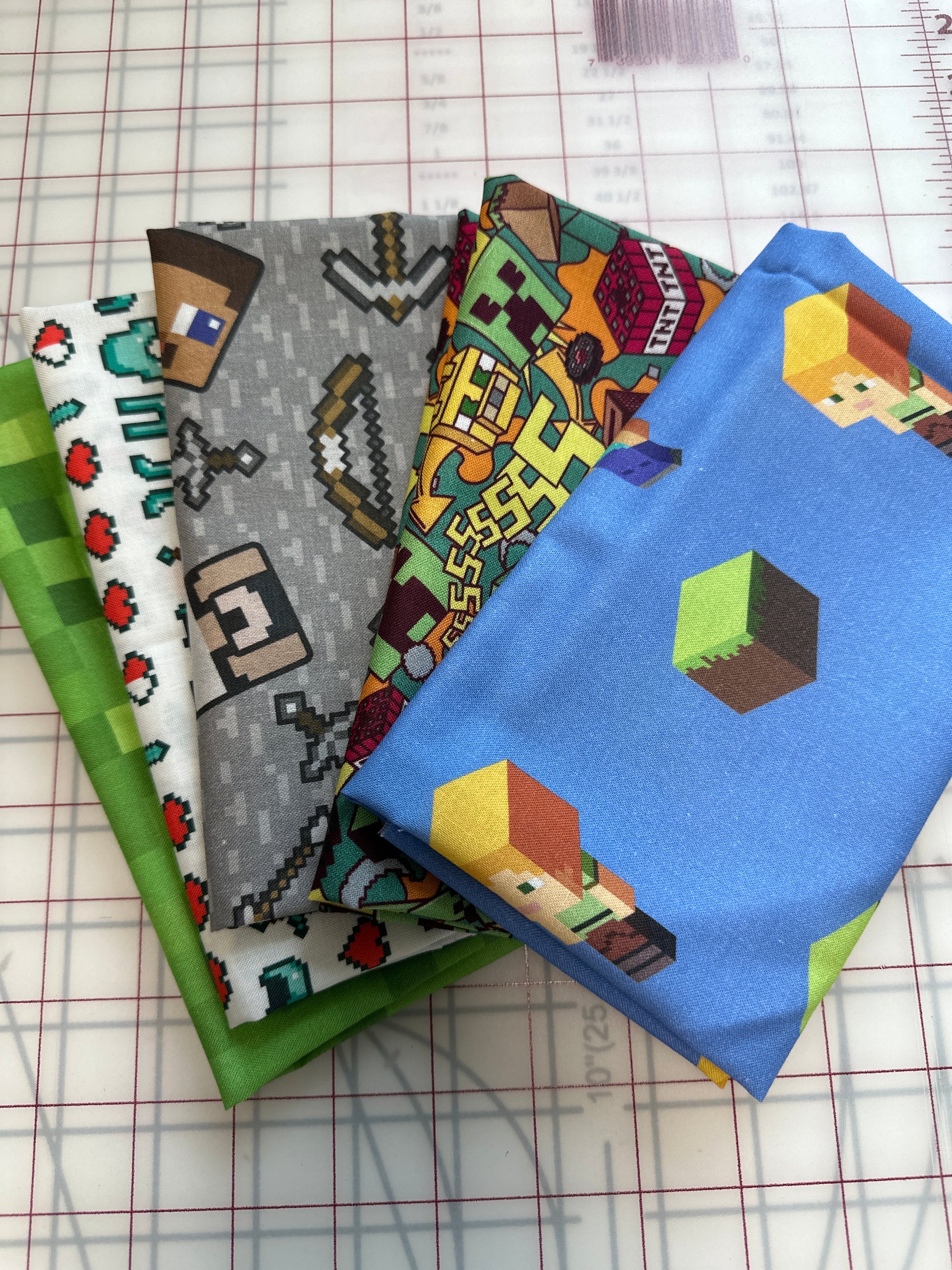 - Each bundle includes 5 fat quarters featuring the Minecraft Fabrics