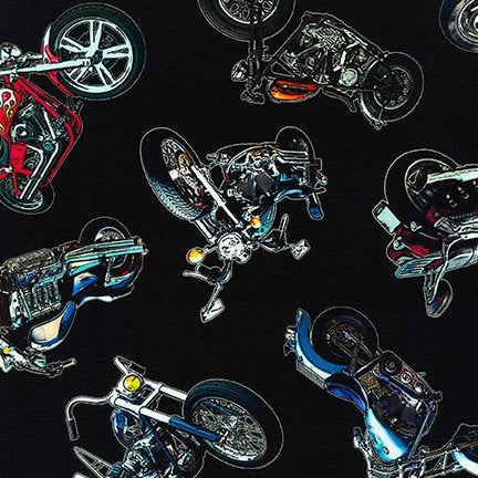 Robert Kaufman - On the Road - Vintage Motorcycles Toss - Black - Priced per half metre