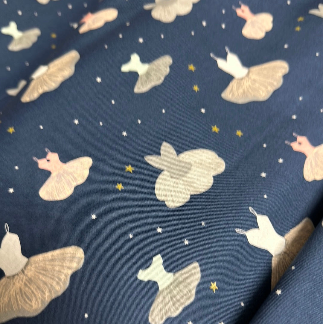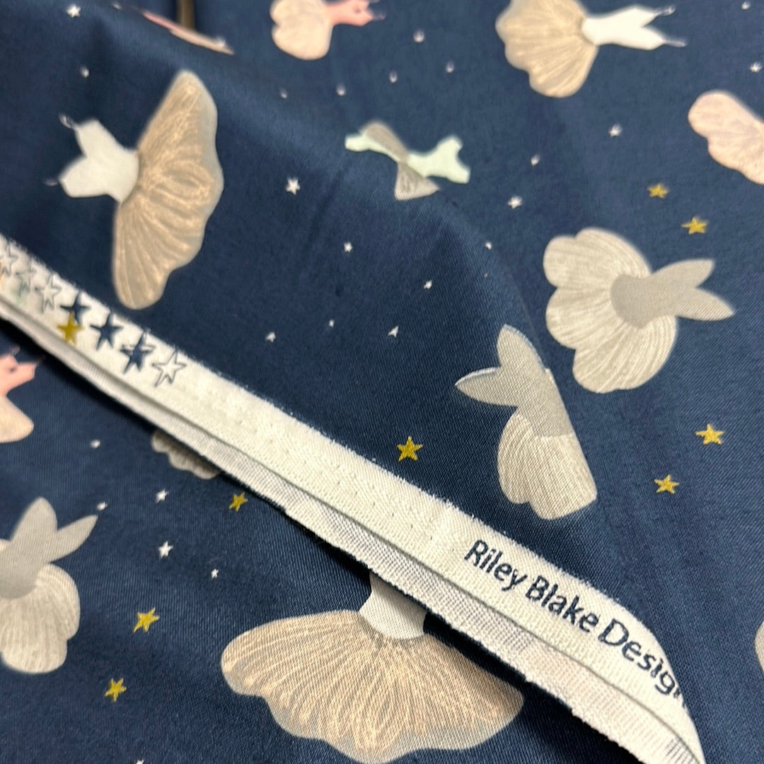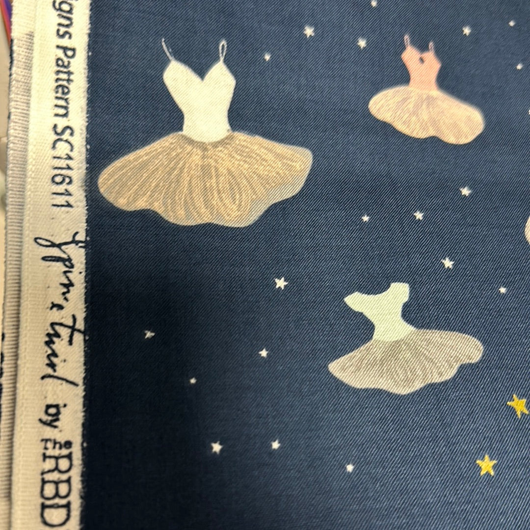 This print features leotards and tutus on a background of scattered stars.