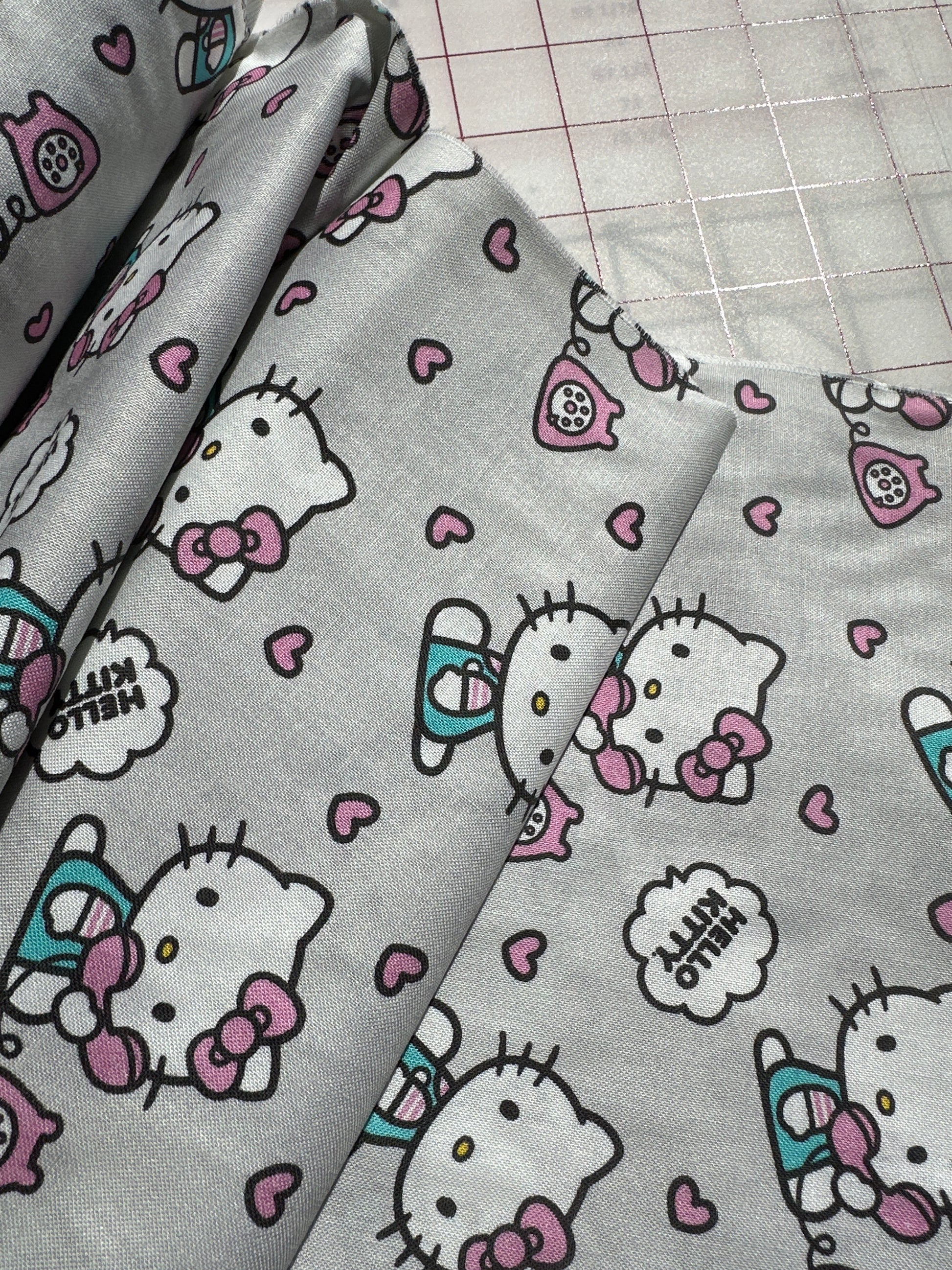 This Fabric features Hello Kitty on the phone with a grey background and is part of the Hello Kitty Sanrio Collection